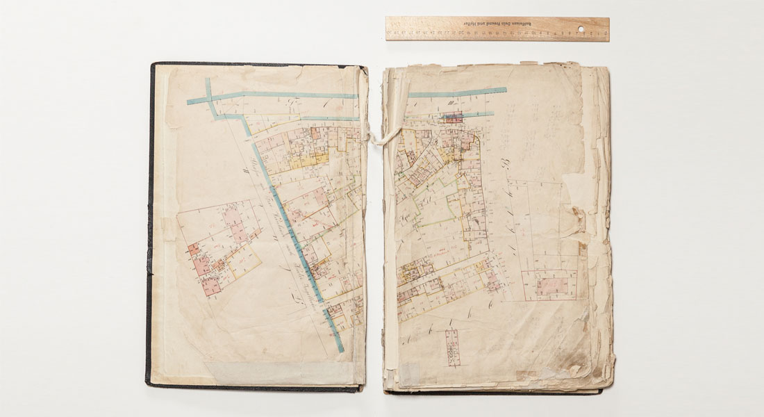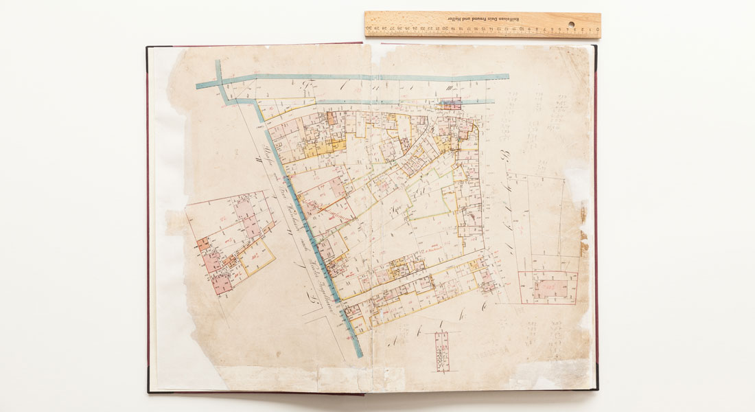Nachzustand: Die alte Heftung wurde vollständig gelöst und alte Reparaturmaterialien wie Tesafilm entfernt. Die einzelnen Karten konnten dann geglättet werden und Risse und Fehlstellen wurden mit Japanpapier und Weizenstärke geschlossen. Nach der eigentlichen Papierrestaurierung konnten die Blätter dann erneut gebunden werden. Hierbei wurde der alte Einband durch einen Konservierungseinband ersetzt, der sich dadurch auszeichnet, dass die Lagen des Buches nicht mehr verklebt werde und sich das Buch später sehr leicht und flach aufschlagen lässt.