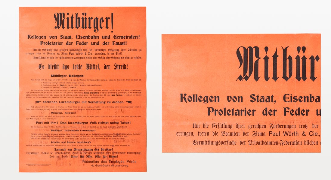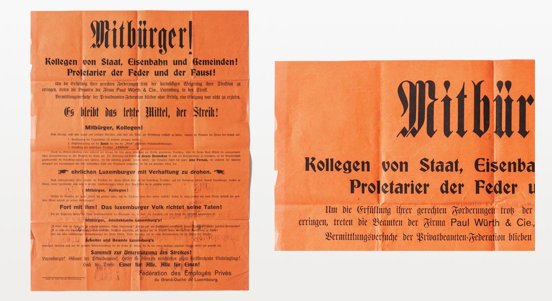 Vorher: Bei diesem Plakat handelt es sich um einen Streikaufruf. Als Material wurde günstiges, dünnes und wenig qualitätvolles Holzschliffpapier verwendet, denn das Blatt musste nicht lange halten. Heute bereitet dies Probleme bei der Aufbewahrung, da das Papier instabil wird. Das Plakat wurde gefaltet aufbewahrt und zeigte störende Knicke und kleinere Risse im Randbereich.